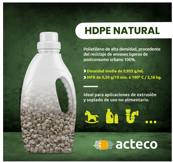 Los Polietilenos de Alta Densidad reciclados por Acteco tienen orígenes distintos, como envases ligeros de postconsumo urbano, garrafas, GRG’S y bidones industriales postconsumo. Con una densidad media de 0.955 g/ml y un índice de flujo de 0.30 g/10 min el HDPE Natural se convierte en una solución circular para aplicaciones de extrusión y soplado de productos como tuberías, garrafas y botellas pequeñas, entre otros.